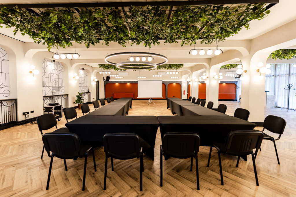 Négyzetes alakú nagy terem, egyik oldala végig üvegezett, kellemes fás zöldfelületre néző.A terem közepén oszlopok találhatóak, melyeket az elrendezéskor figyelembe kell venni.Alapterülete 243,6 m2, méretei 15×15 mElrendezéstől függően 100-160 fő